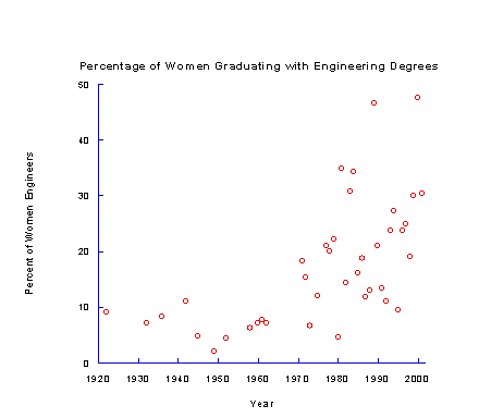 "It is becoming more and more widely recognized that there is a place for women in engineering; a field which has until recently been the almost exclusive province of men. One would guess, moreover, that the time is not far off, if it has not already arrived, when women engineers will be held in the same regard by their colleagues and the public as are women in the practice of medicine." However, in year 2002, the number of women graduating