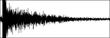 Using the recording Walkman, find a place on campus whose reverberation time you would like to measure. Record a balloon pop with the microphone located about 10 feet (3 m) from the balloon and then play back the recording while you listen on the headphones, re-setting the counter to zero at the sound of the pop. Take the recorder to a non-PowerPC Mac that can run SoundEdit 2.0.5 (in Hicks 314 or equivalent) and connect the recorder to the computer using a patch cord (the stereo jack end of the cord should be in the tape player's headphone plug and one of the mono jack ends of the cord should be in the computer's microphone input plug). Rewind the tape slightly and play back the tape while SoundEdit is recording (hint: best results are obtained when the volume control of the tape player is set quite low but not too low; you may have to rewind and try several different volume control settings). Experiment to get the least clipping of the pop while obtaining a good decay shape such as this:
