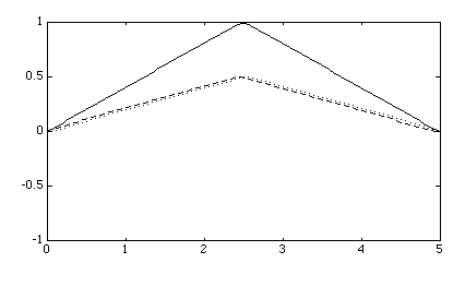 A perfectly elastic string is held at its midpoint, pulled vertically a height of 1 unit, then released as shown in Figure 1. The solution to the subsequent motion of the string can be described by two "phantom" waves, one traveling to the right (the dotted one on Figure 1) and one traveling to the left (the dashed one) at speed v. Write a Matlab script to plot the two phantom waves and their sum, which represents the actual motion of the string, over one complete cycle of the string's motion. The plot should be arranged to show the pinned ends of the string at the left and right of the graph. Using the drop box on the Classes file server, hand in your script only (with your username as the script name before the ".m").